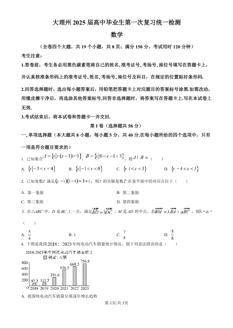 云南省大理州2025届高中毕业生第一次复习统一检测 数学