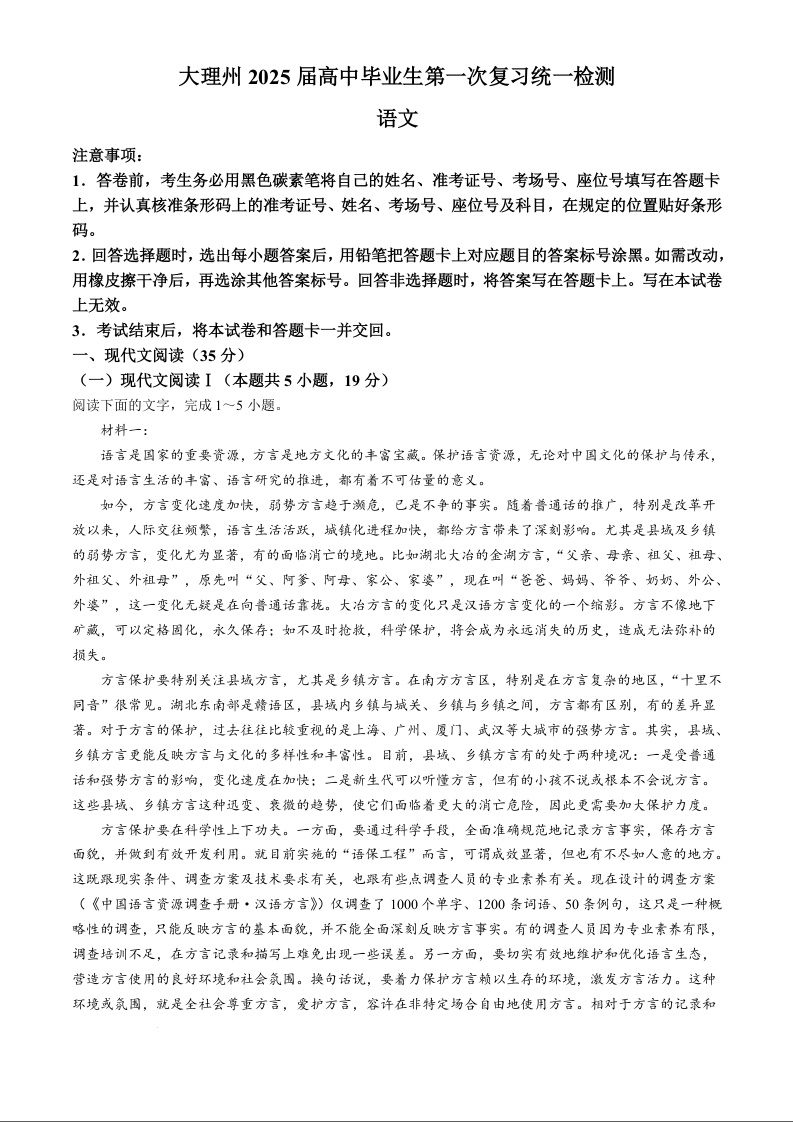 云南省大理州2025届高中毕业生第一次复习统一检测 语文
