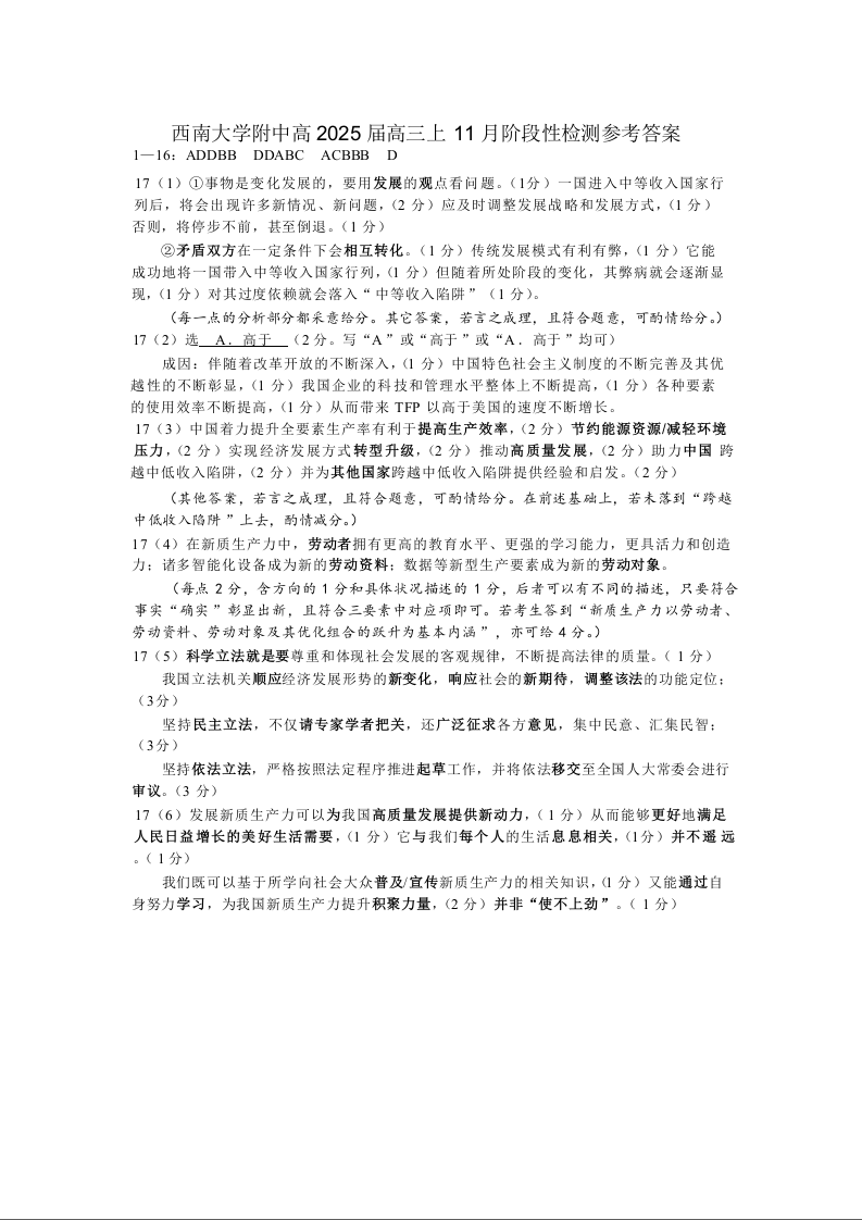 重庆市西南大学附中高2025届高三上11月阶段性检测 政治答案