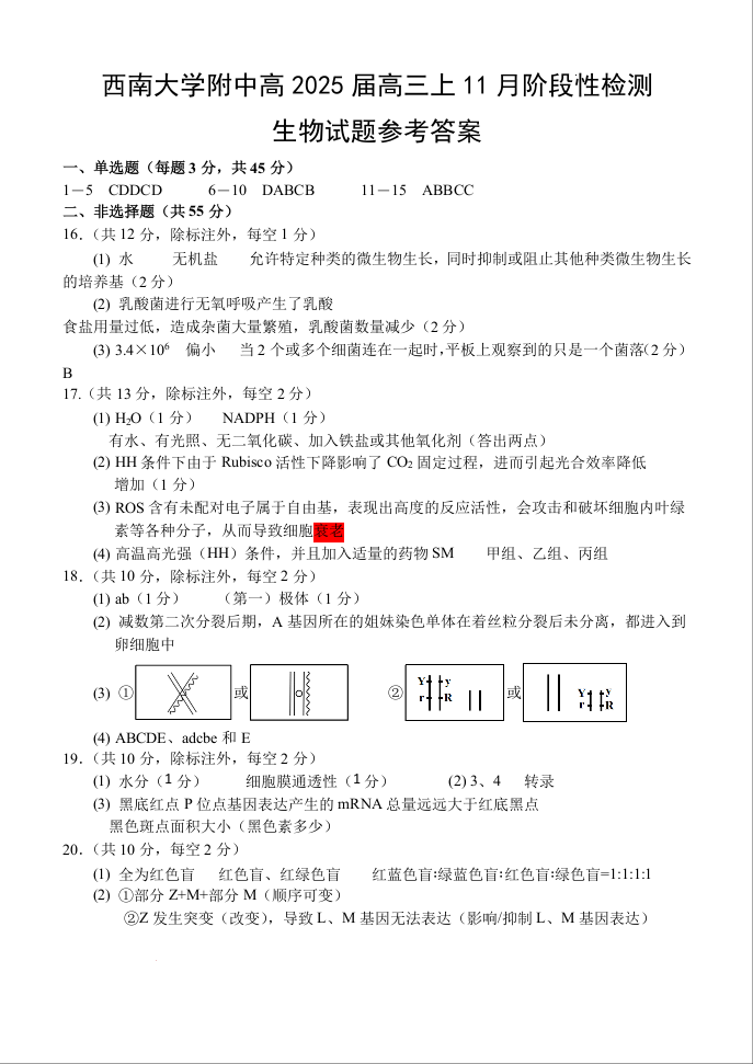 重庆市西南大学附中高2025届高三上11月阶段性检测 生物答案