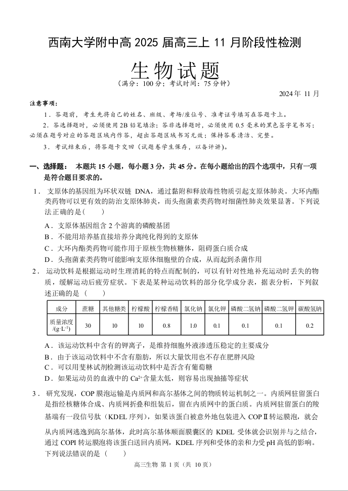 重庆市西南大学附中高2025届高三上11月阶段性检测 生物