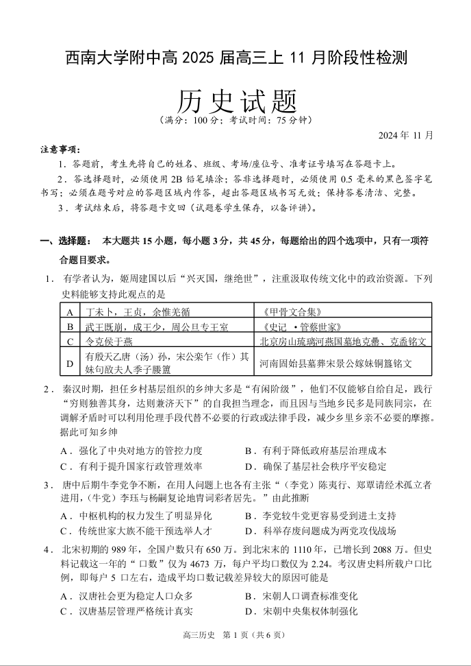 重庆市西南大学附中高2025届高三上11月阶段性检测 历史