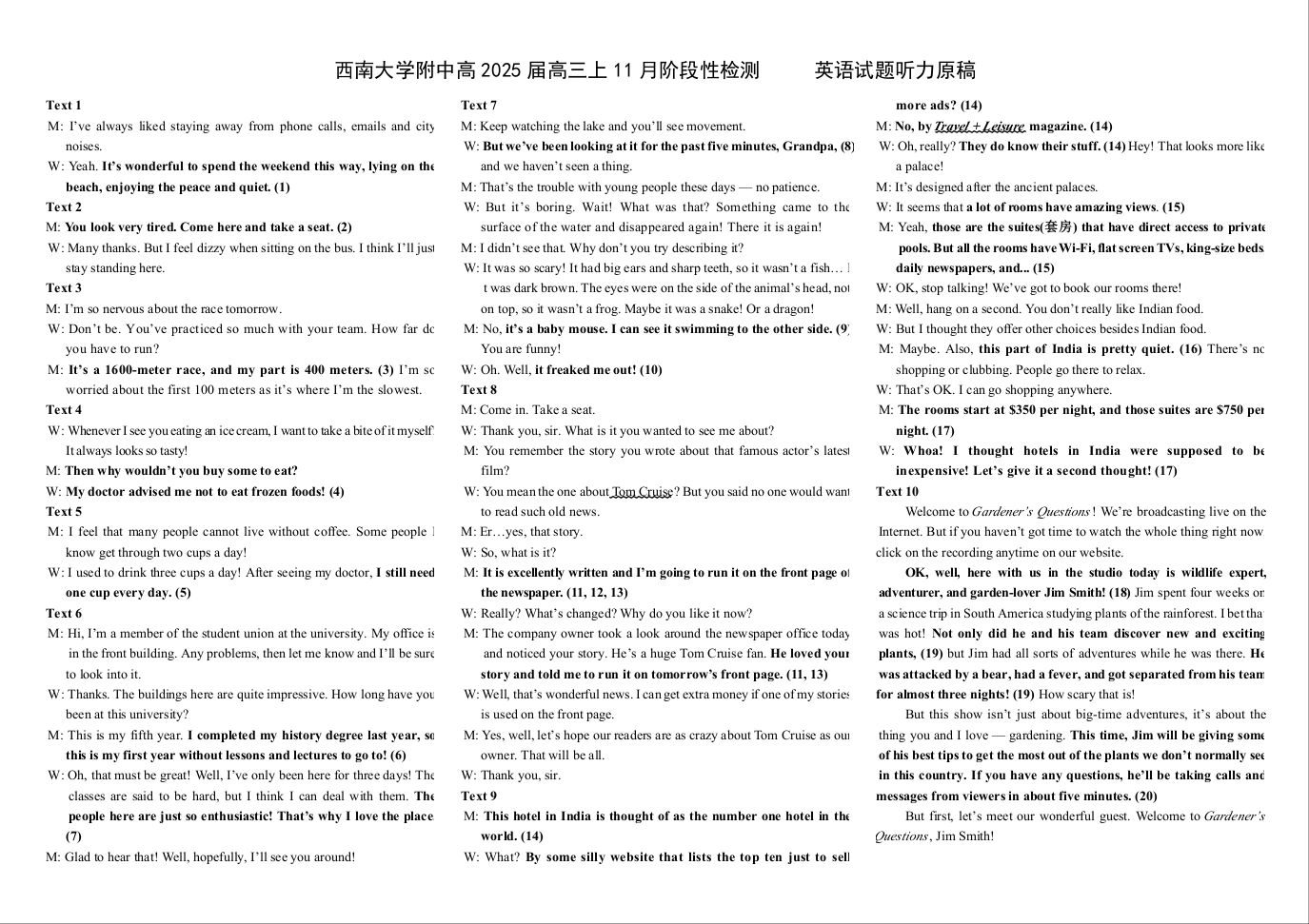 重庆市西南大学附中高2025届高三上11月阶段性检测 英语答案