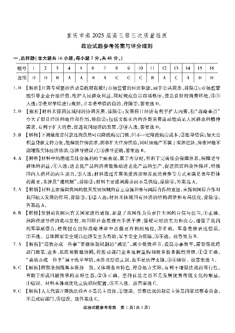 重庆市南开中学高2025届高三第三次质量检测 政治答案