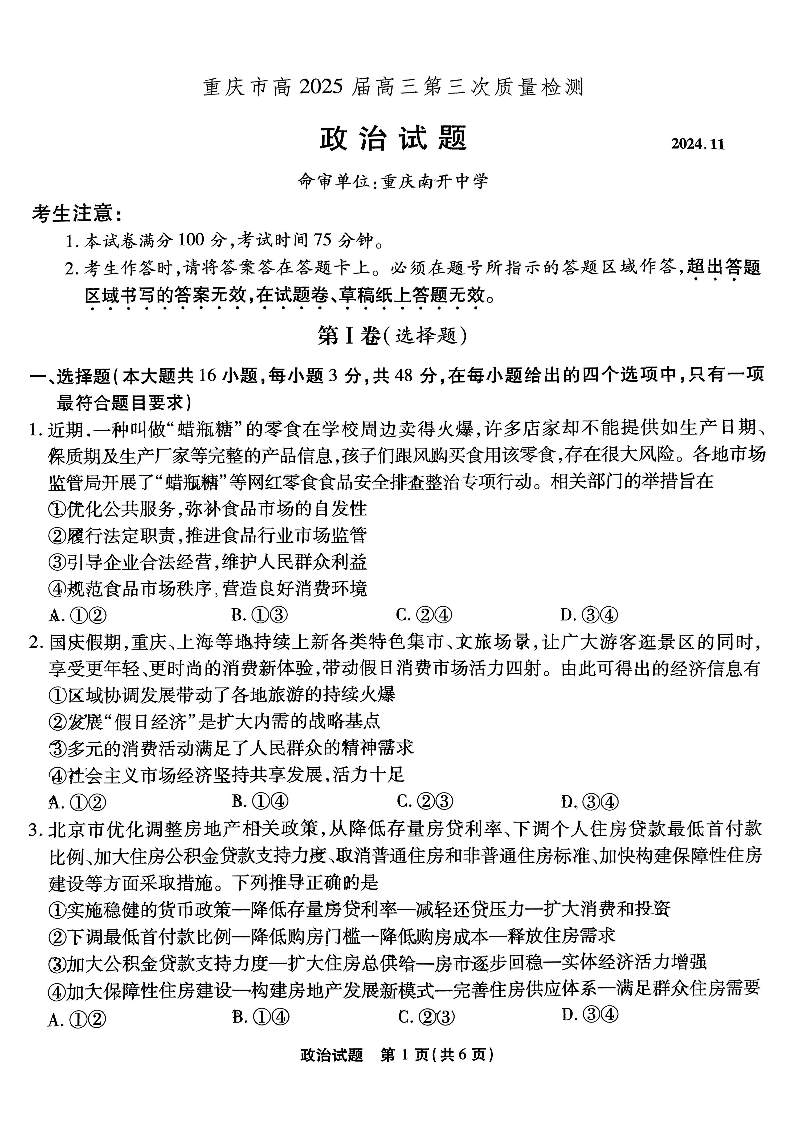 重庆市南开中学高2025届高三第三次质量检测 政治