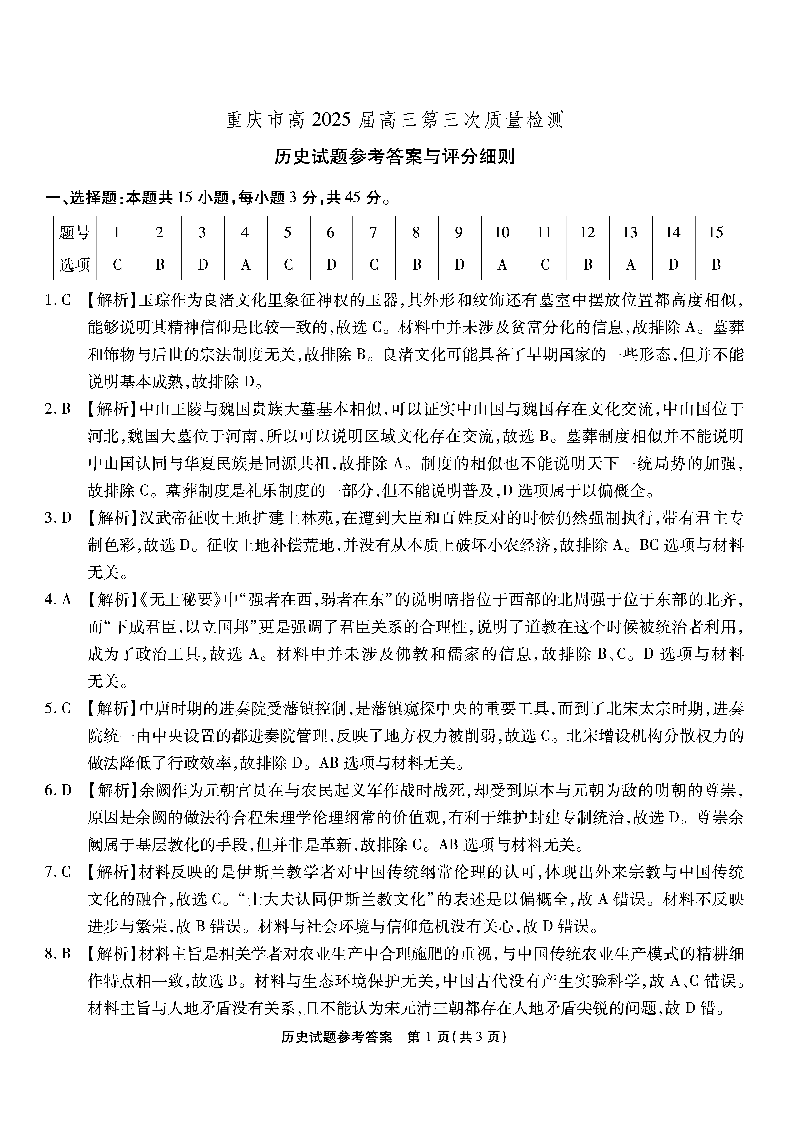 重庆市南开中学高2025届高三第三次质量检测 历史答案