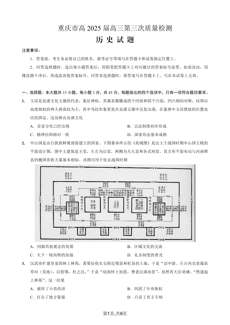 重庆市南开中学高2025届高三第三次质量检测 历史