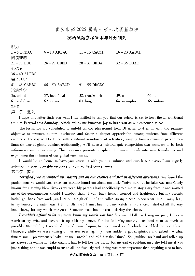 重庆市南开中学高2025届高三第三次质量检测 英语答案