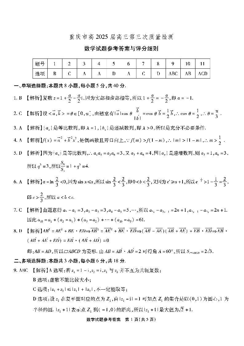 重庆市南开中学高2025届高三第三次质量检测 数学答案