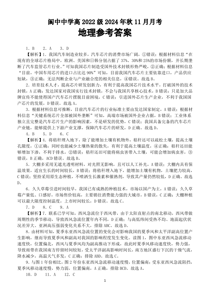 四川省南充市阆中中学2025届高三上学期11月月考 地理答案