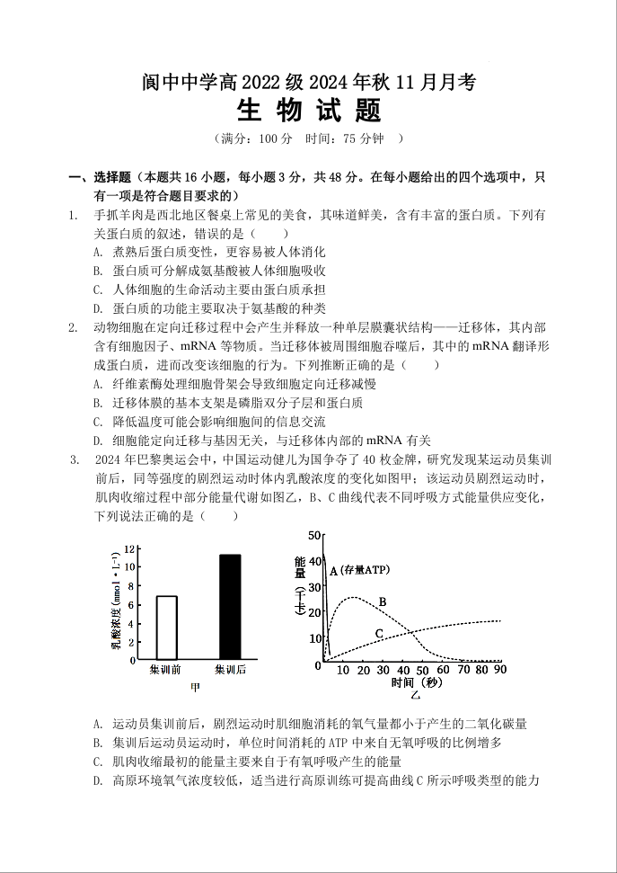 四川省南充市阆中中学2025届高三上学期11月月考 生物