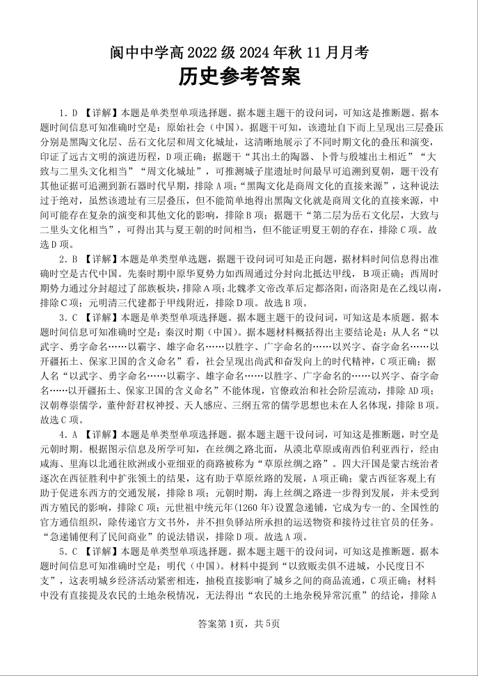 四川省南充市阆中中学2025届高三上学期11月月考 历史答案