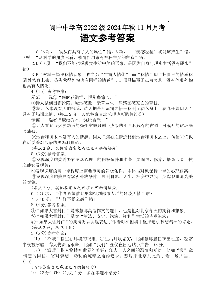 四川省南充市阆中中学2025届高三上学期11月月考 语文答案