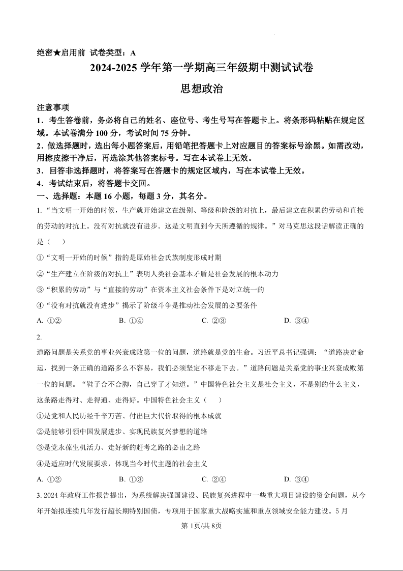 内蒙古自治区锡林郭勒盟2024-2025学年第一学期高三年级期中测试 政治