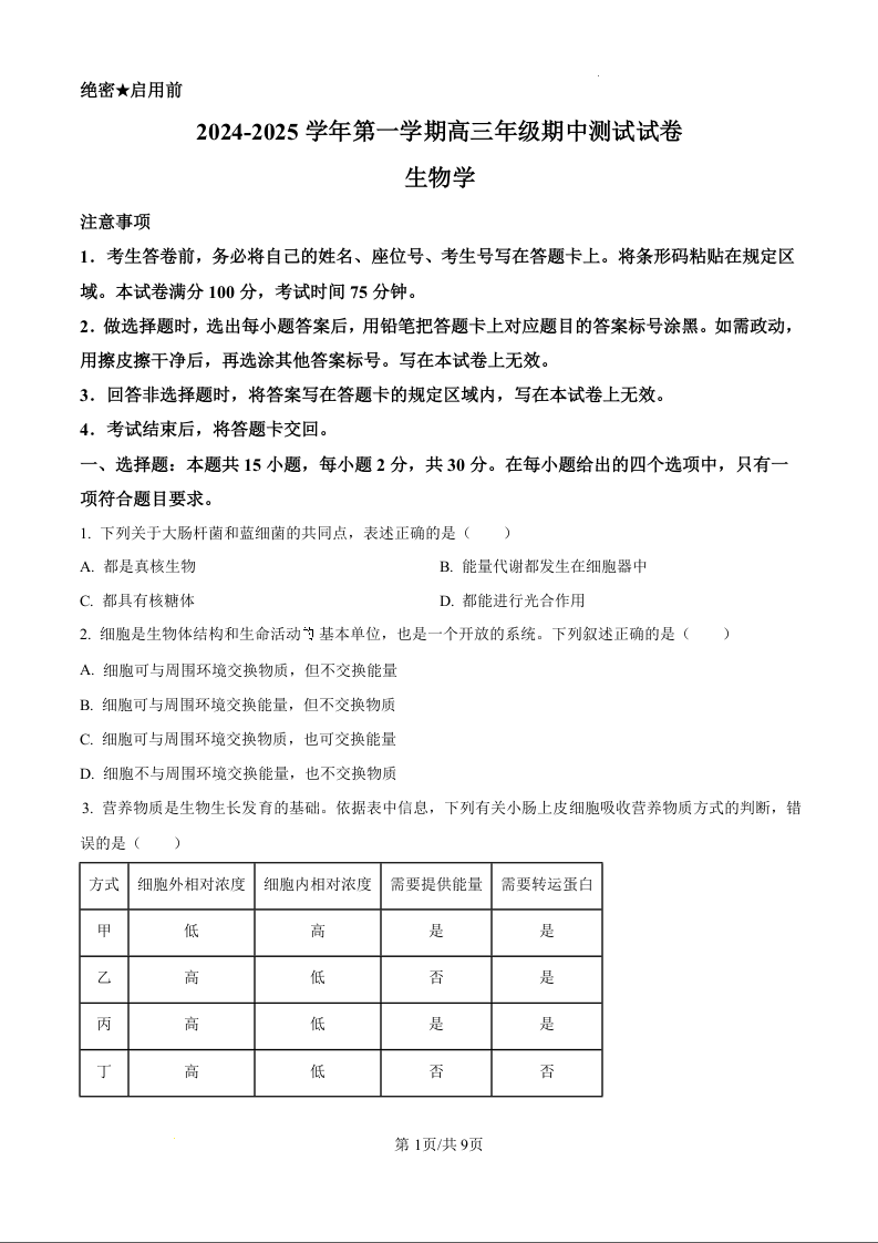 内蒙古自治区锡林郭勒盟2024-2025学年第一学期高三年级期中测试 生物