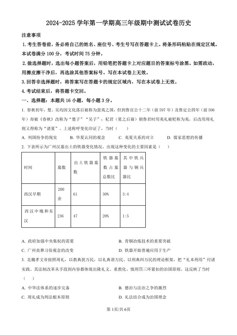 内蒙古自治区锡林郭勒盟2024-2025学年第一学期高三年级期中测试 历史