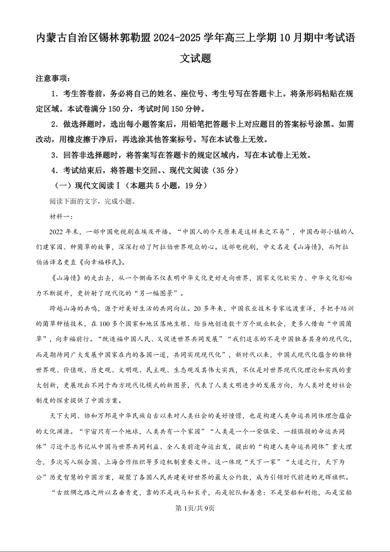 内蒙古自治区锡林郭勒盟2024-2025学年第一学期高三年级期中测试 语文