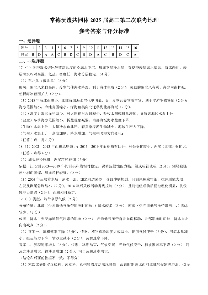 湖南省沅澧共同体2024-2025学年高三上学期第二次联考 地理答案