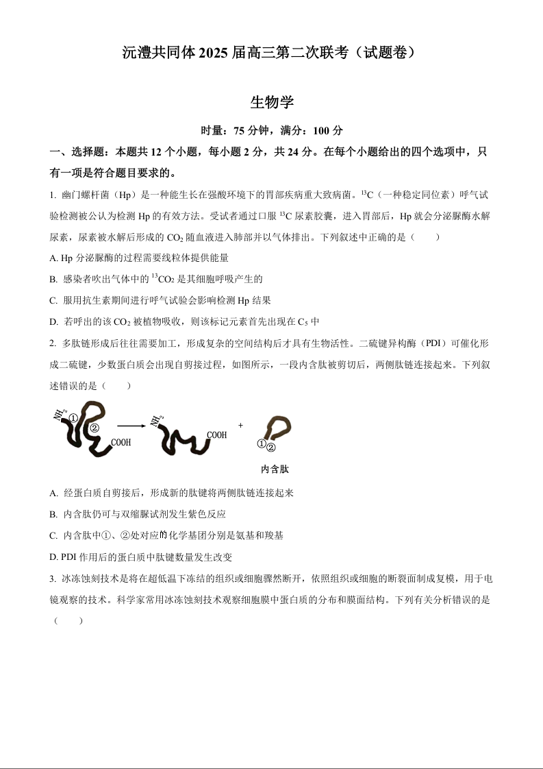 湖南省沅澧共同体2024-2025学年高三上学期第二次联考 生物