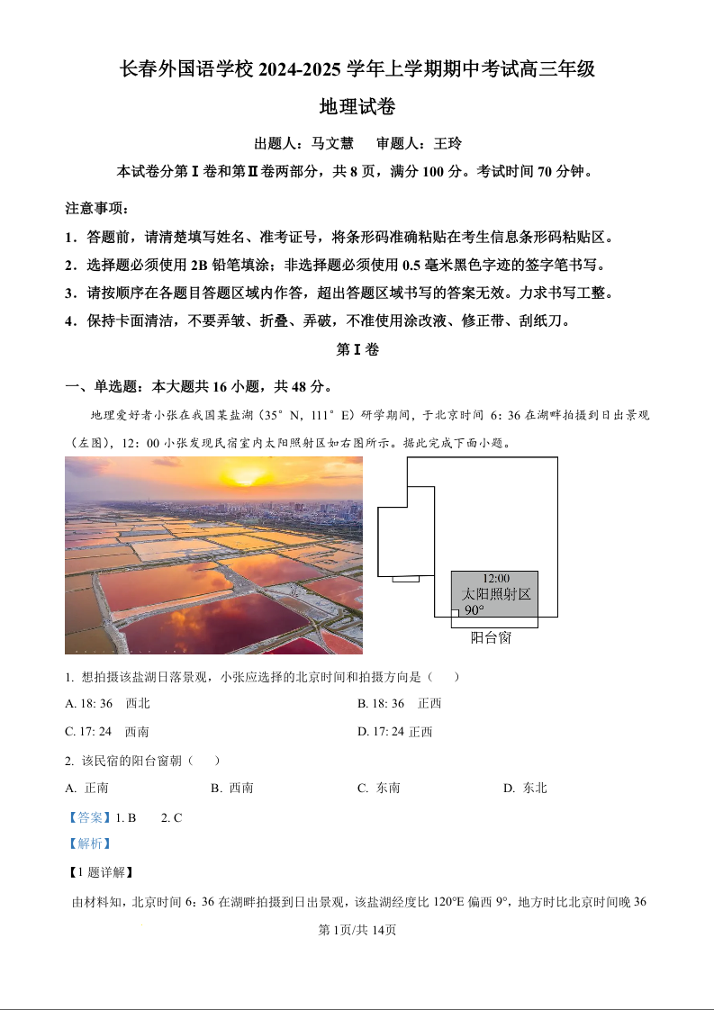 吉林省长春市朝阳区长春外国语学校2025届高三上学期期中考试 地理答案