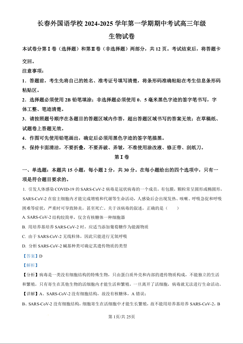 吉林省长春市朝阳区长春外国语学校2025届高三上学期期中考试 生物答案