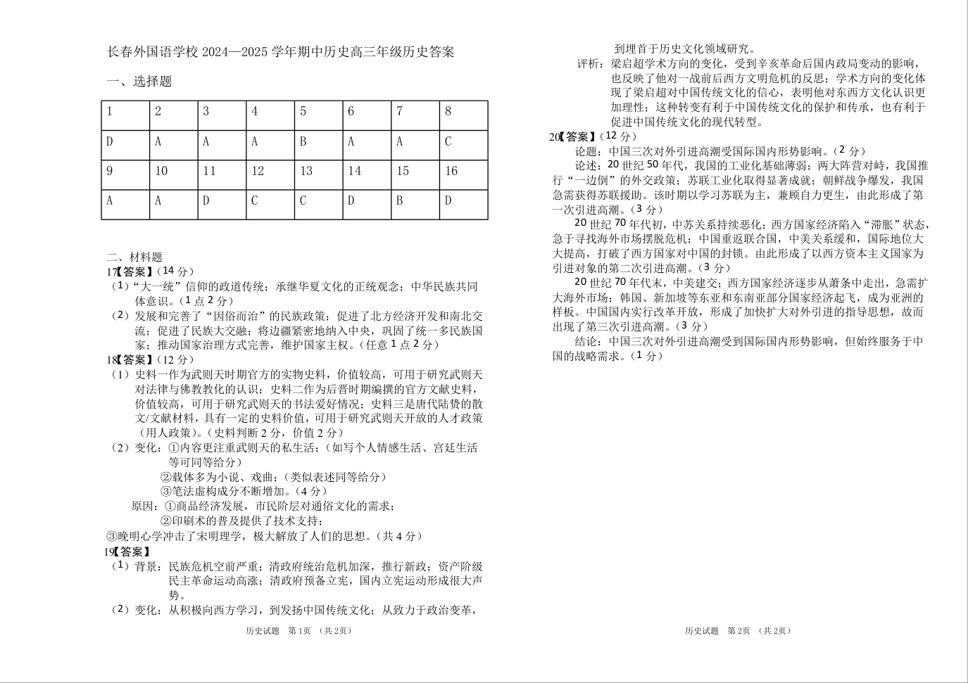 吉林省长春市朝阳区长春外国语学校2025届高三上学期期中考试 历史答案