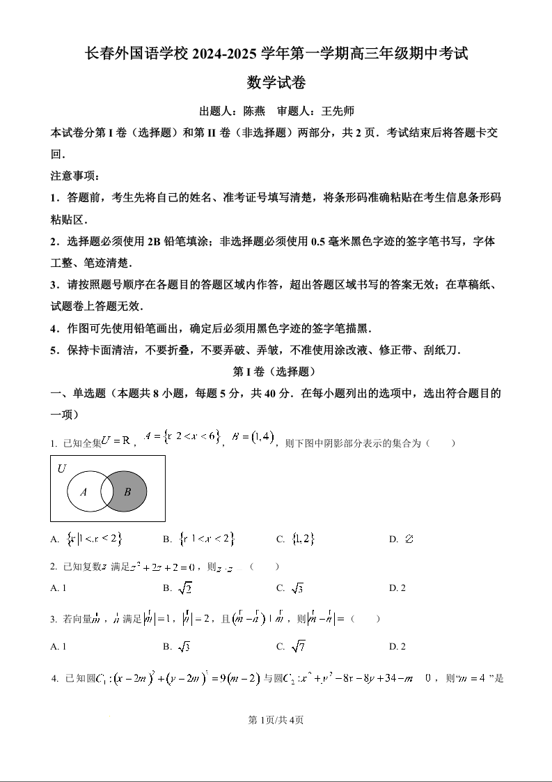 吉林省长春市朝阳区长春外国语学校2025届高三上学期期中考试 数学