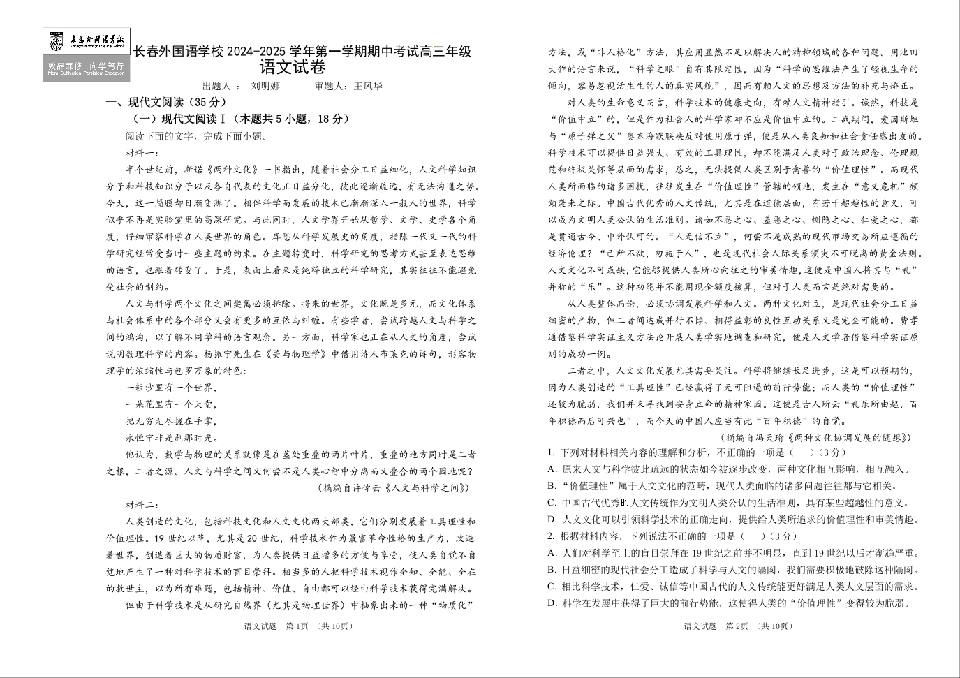 吉林省长春市朝阳区长春外国语学校2025届高三上学期期中考试 语文