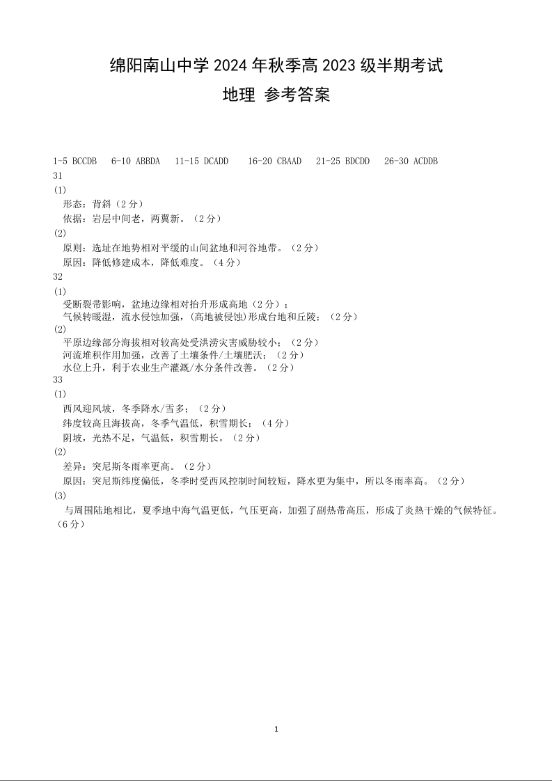 四川省绵阳市南山中学2024-2025学年高二上学期期中考试 地理答案