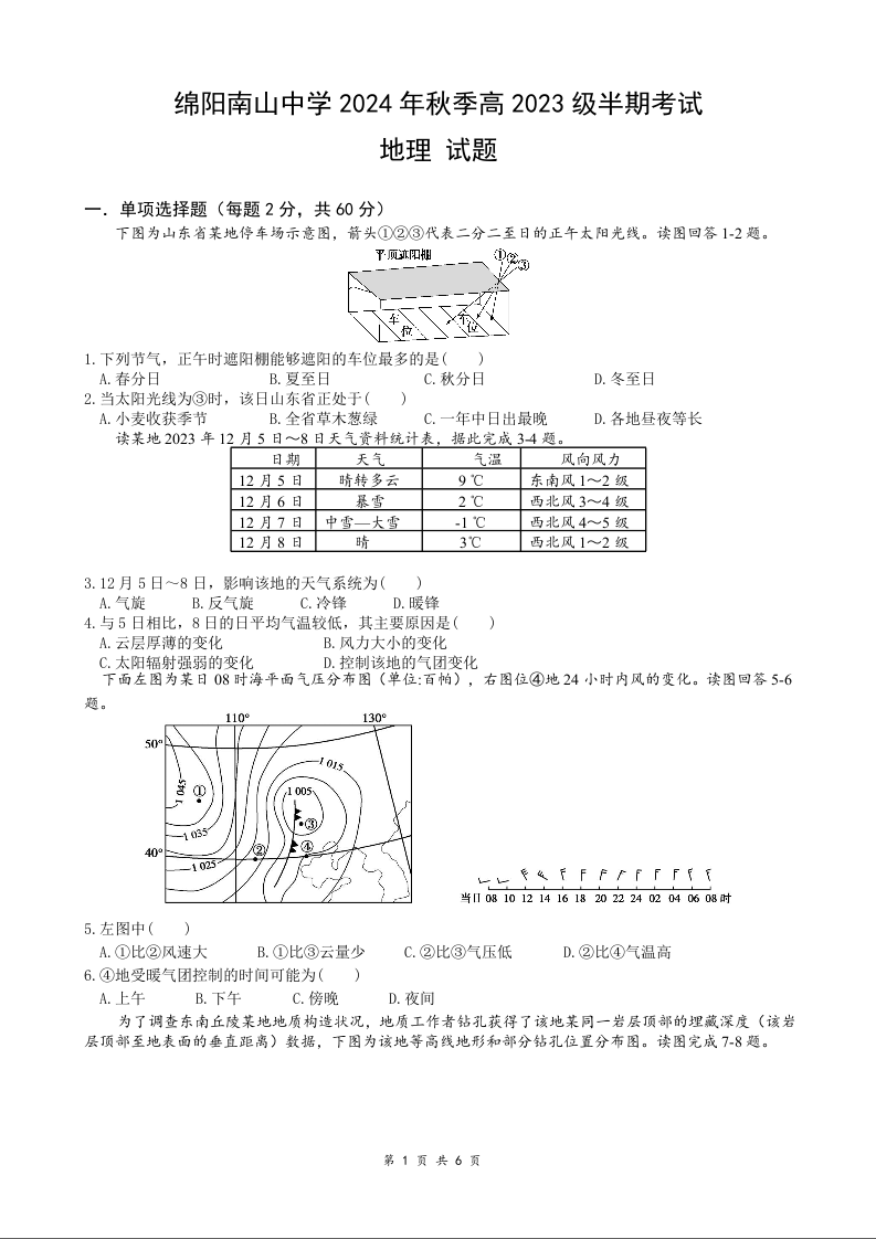 四川省绵阳市南山中学2024-2025学年高二上学期期中考试 地理
