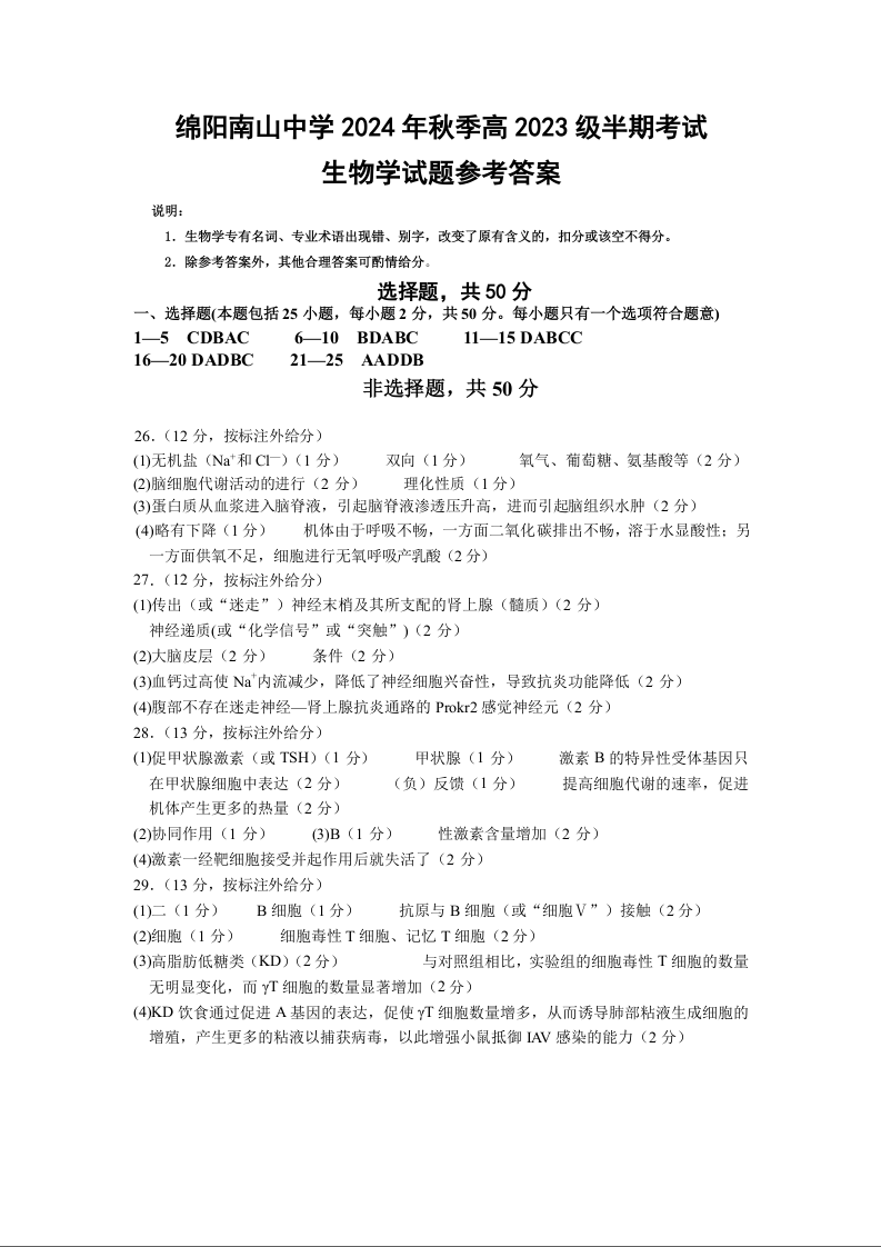 四川省绵阳市南山中学2024-2025学年高二上学期期中考试 生物答案
