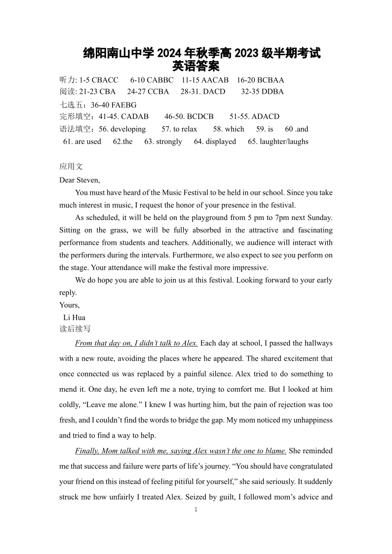 四川省绵阳市南山中学2024-2025学年高二上学期期中考试 英语答案