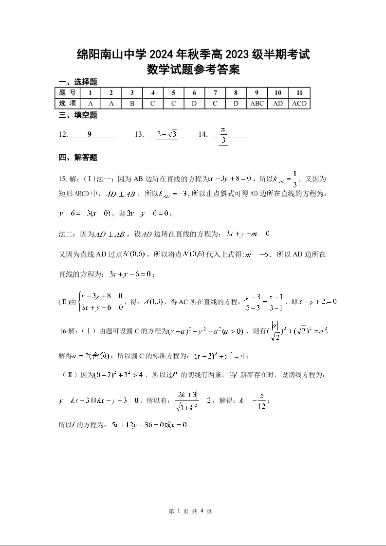 四川省绵阳市南山中学2024-2025学年高二上学期期中考试 数学答案