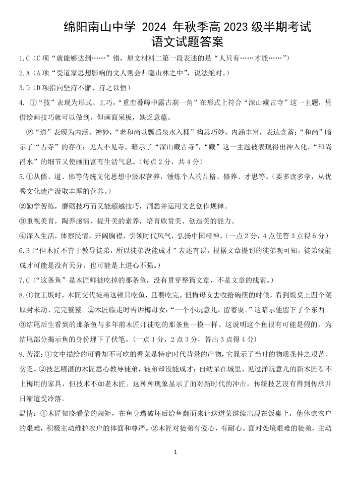 四川省绵阳市南山中学2024-2025学年高二上学期期中考试 语文答案