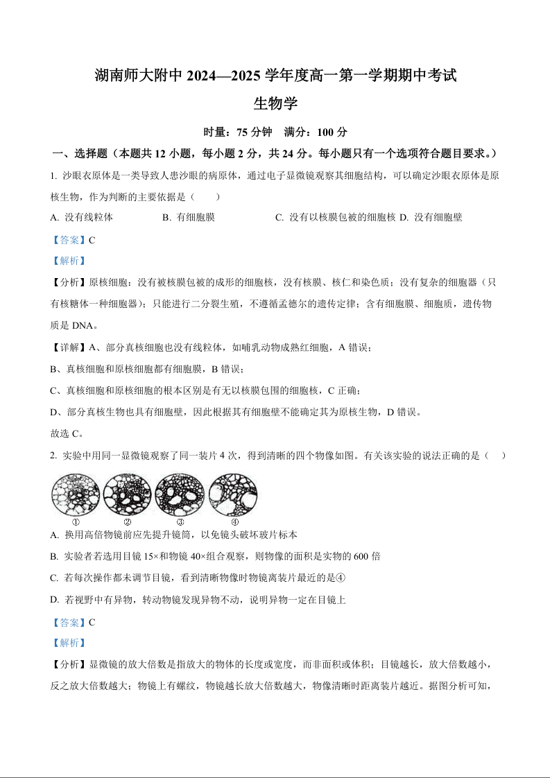 湖南师大附中2024-2025学年度高一第一学期期中考试 生物答案