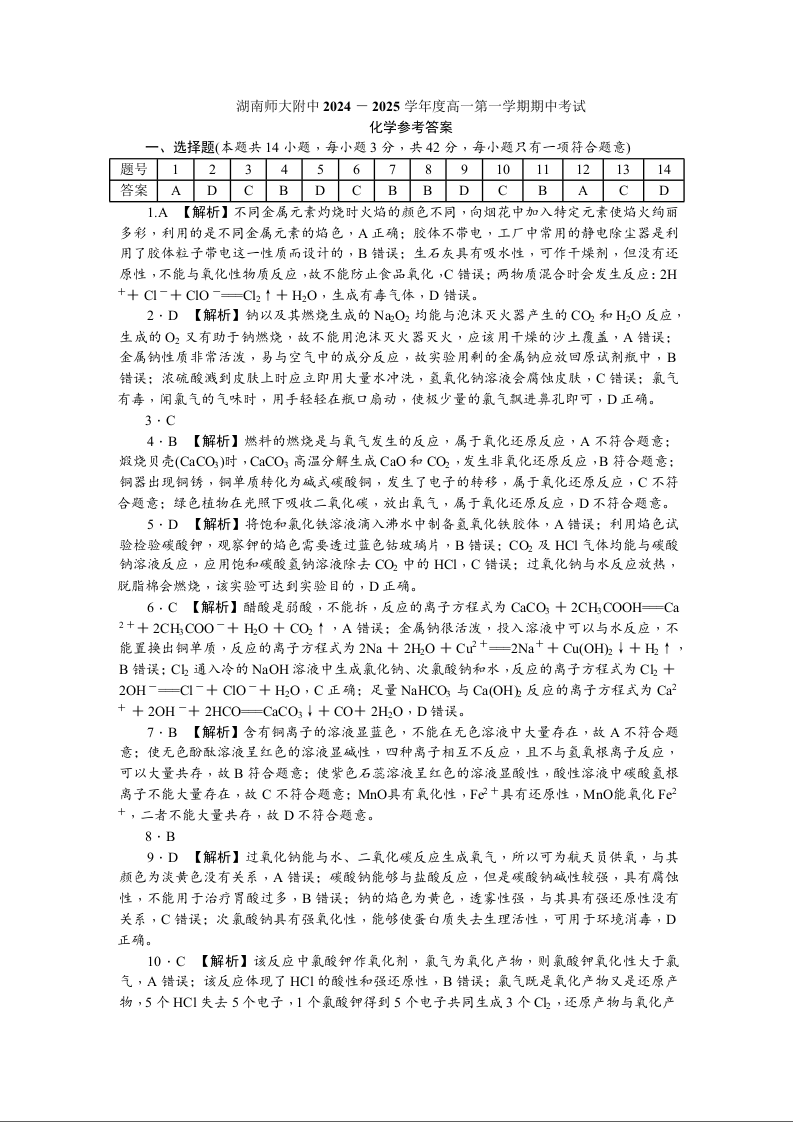 湖南师大附中2024-2025学年度高一第一学期期中考试 化学答案