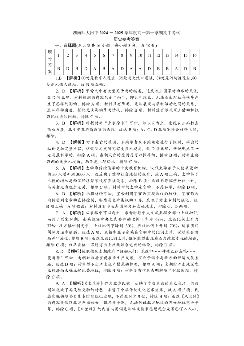 湖南师大附中2024-2025学年度高一第一学期期中考试 历史答案