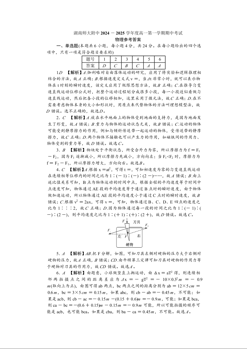 湖南师大附中2024-2025学年度高一第一学期期中考试 物理答案