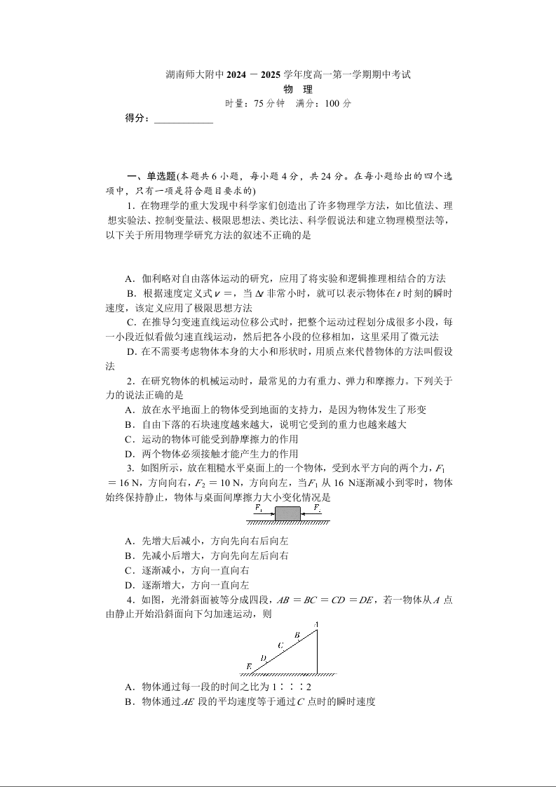 湖南师大附中2024-2025学年度高一第一学期期中考试 物理