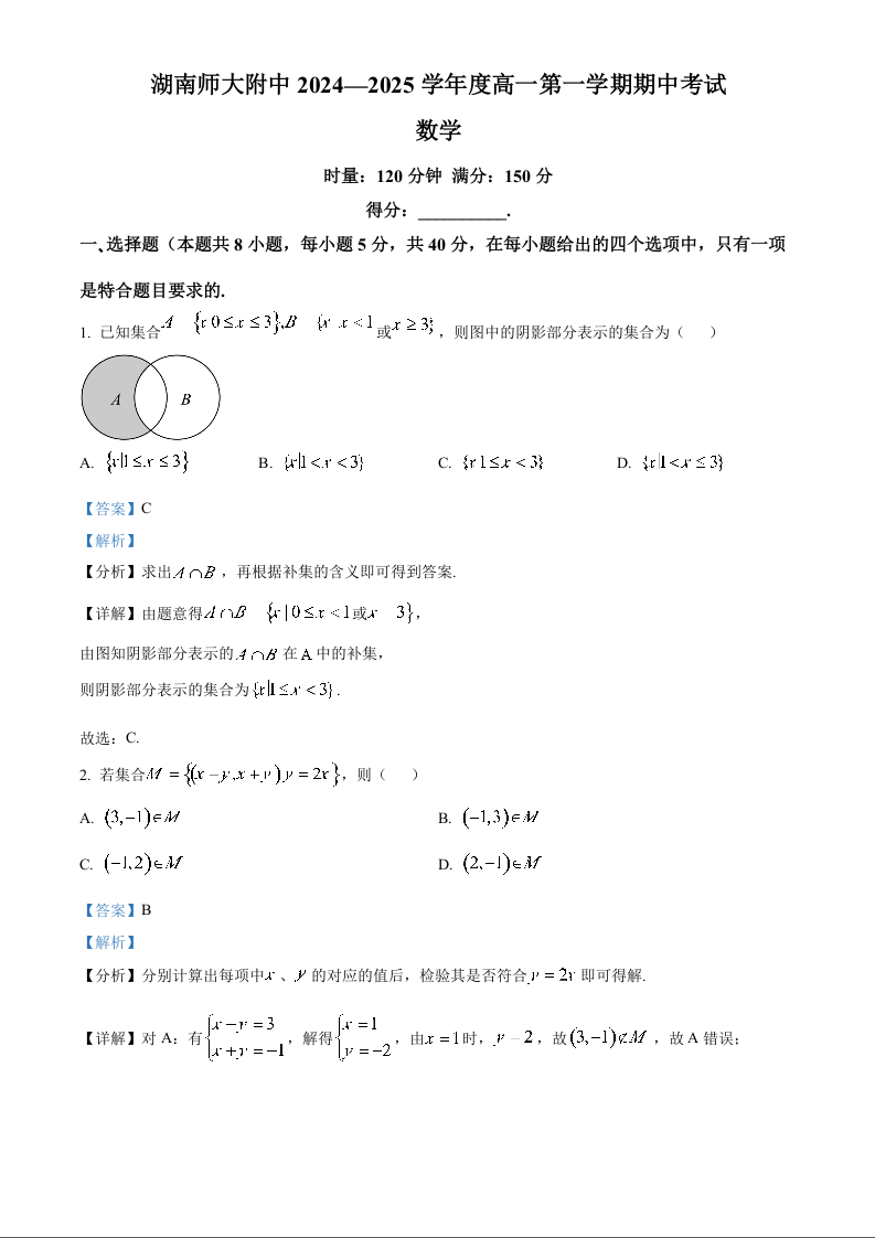 湖南师大附中2024-2025学年度高一第一学期期中考试 数学答案