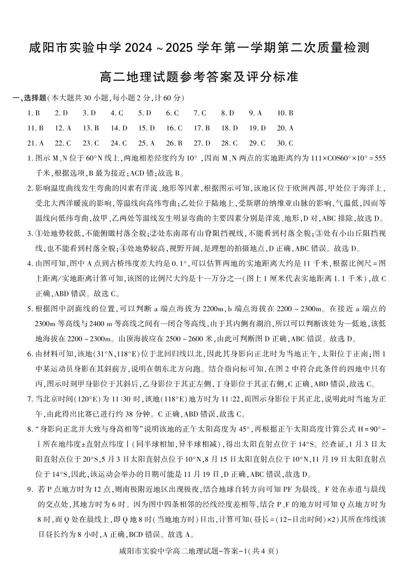 咸阳市实验中学2024-2025学高二第一学期第二次质量检测 地理答案