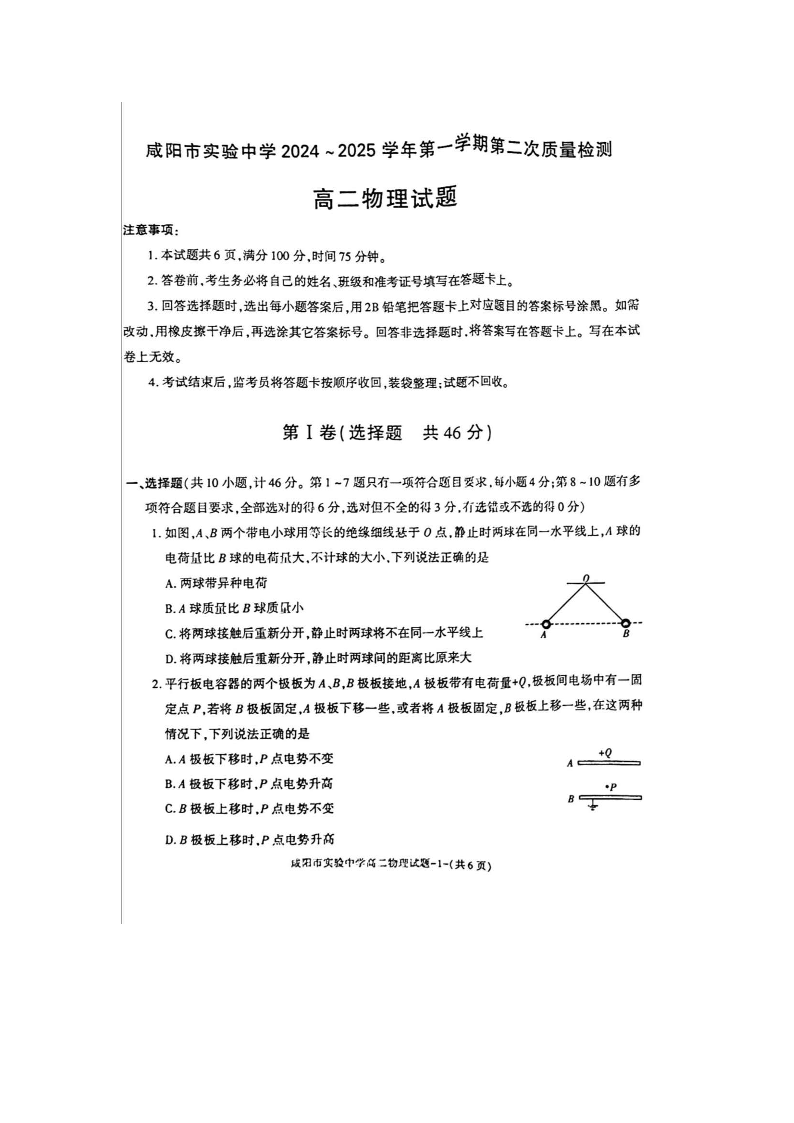 咸阳市实验中学2024-2025学高二第一学期第二次质量检测 物理