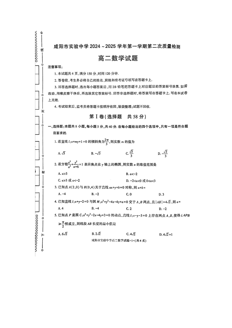 咸阳市实验中学2024-2025学高二第一学期第二次质量检测 数学