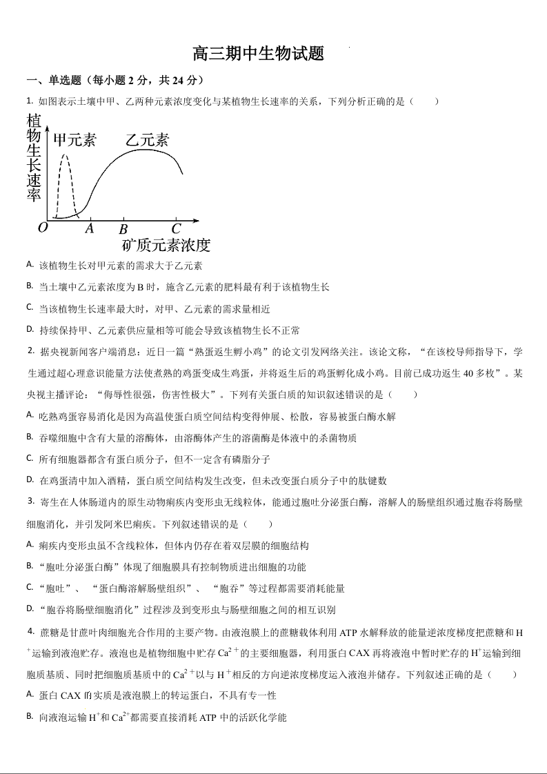 吉林省通化市梅河口市第五中学2025届高三上学期11月期中考试 生物