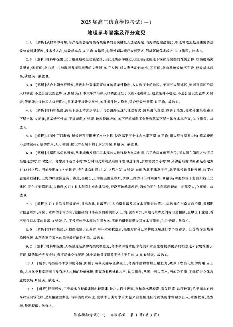 2025届陕西省教育联盟高三上学期仿真模拟(一)地理答案