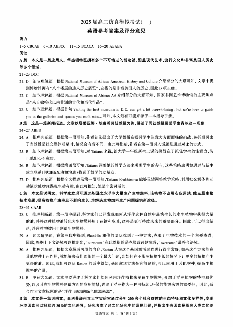 2025届陕西省教育联盟高三上学期仿真模拟(一)英语答案