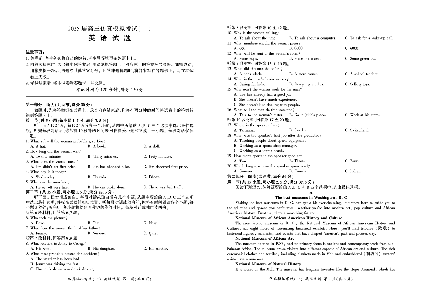 2025届陕西省教育联盟高三上学期仿真模拟(一)英语