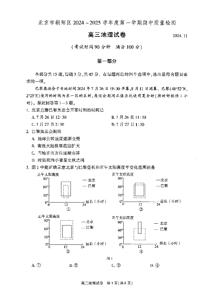 北京市朝阳区2024-2025学年高三第一(上)学期期中质量检测 地理
