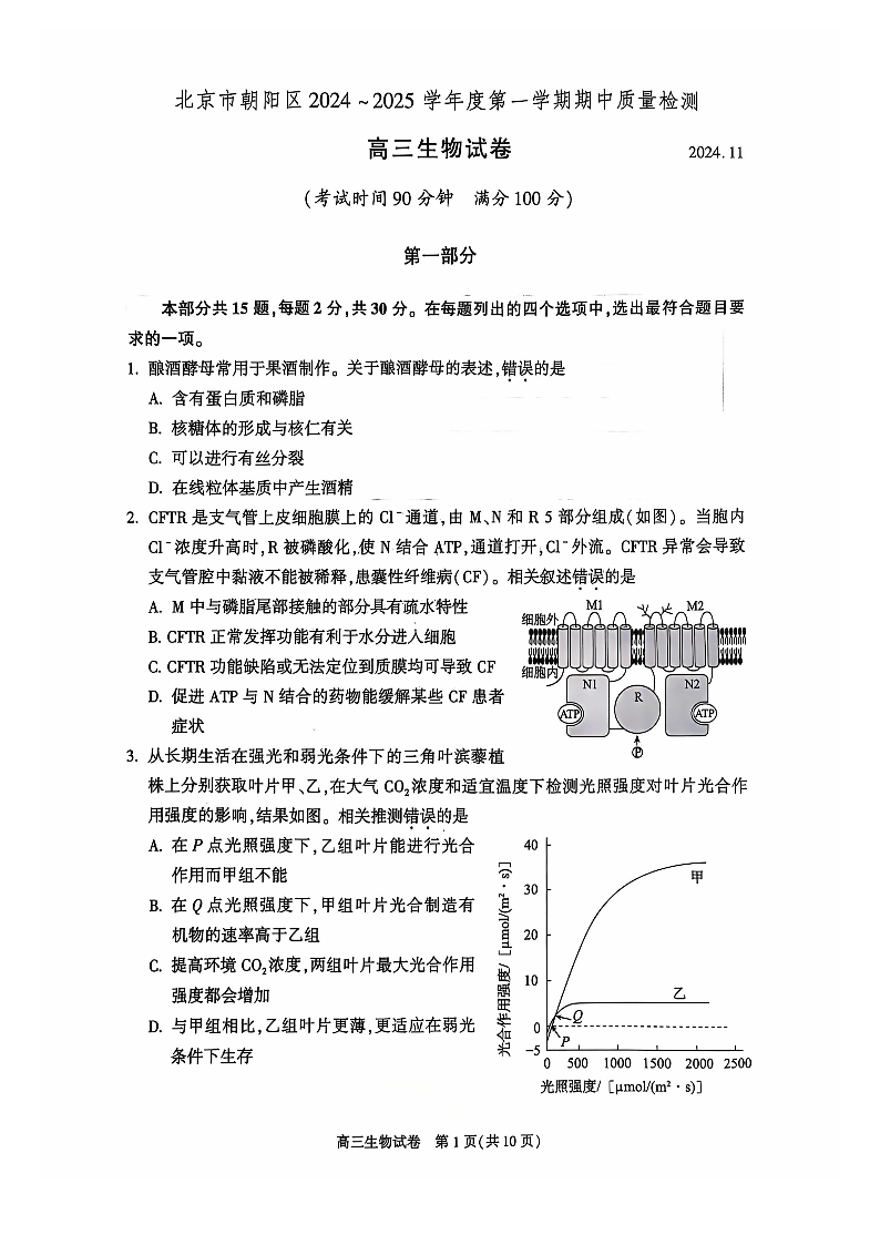 北京市朝阳区2024-2025学年高三第一(上)学期期中质量检测 生物