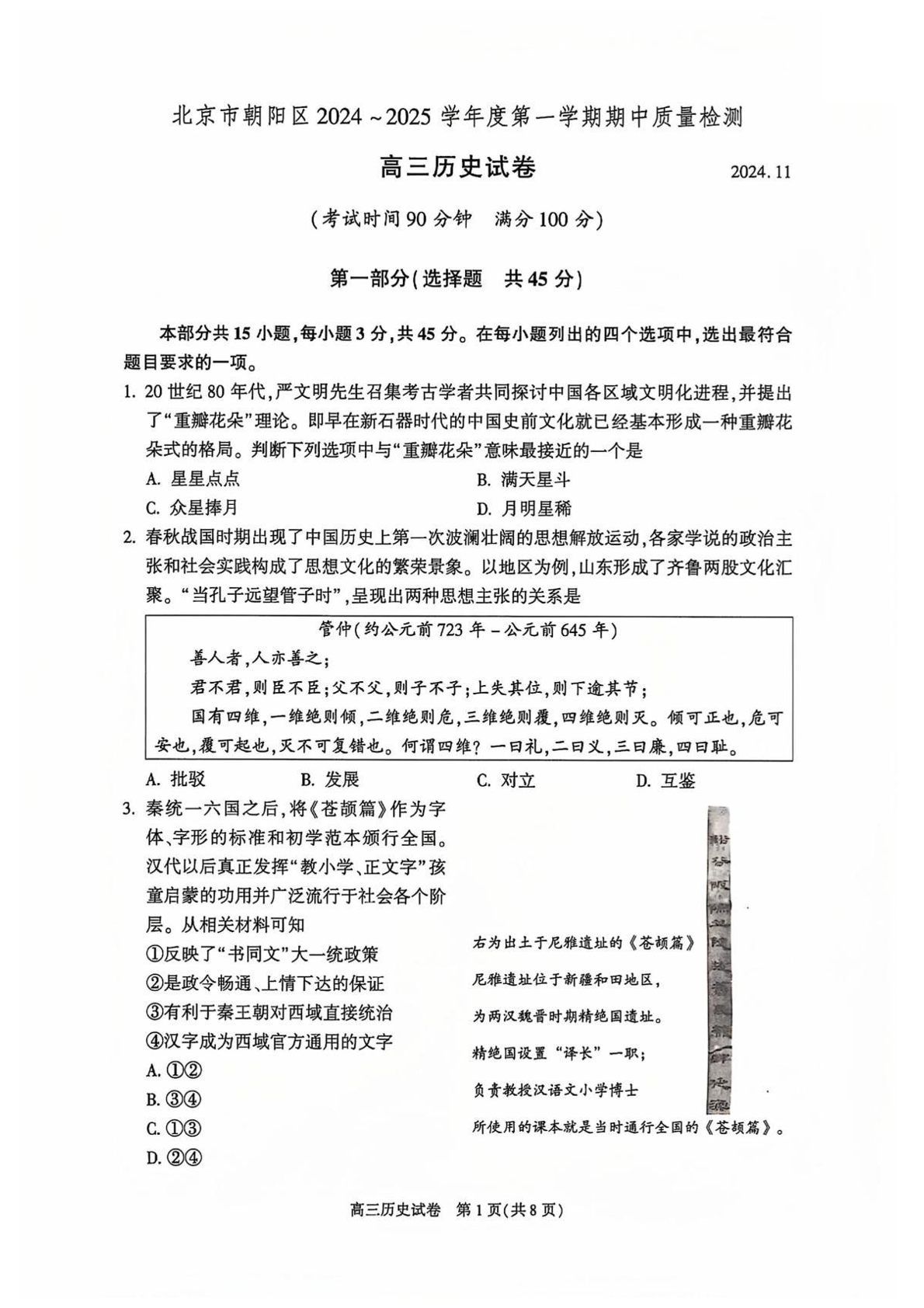 北京市朝阳区2024-2025学年高三第一(上)学期期中质量检测 历史